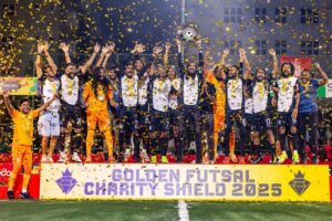 ދިވެހިރާއްޖޭގައި ބޭއްވޭ އެންމެ ބޮޑު ފުޓްސަލް މުބާރާތް ކަމުގައިވާ ގޯލްޑަން ފުޓްސަލް ޗެލެންޖް-2025 ފެށުމުގެ ގޮތުން ގޯލްޑަން ފުޓްސަލް އެސޯސިއޭޝަނުން އިންތިޒާމުކުރި ޗެރިޓީ ޝީލްޑް މެޗު ލ. ގަމުން ކާމިޔާބުކޮށްފިއެވެ.